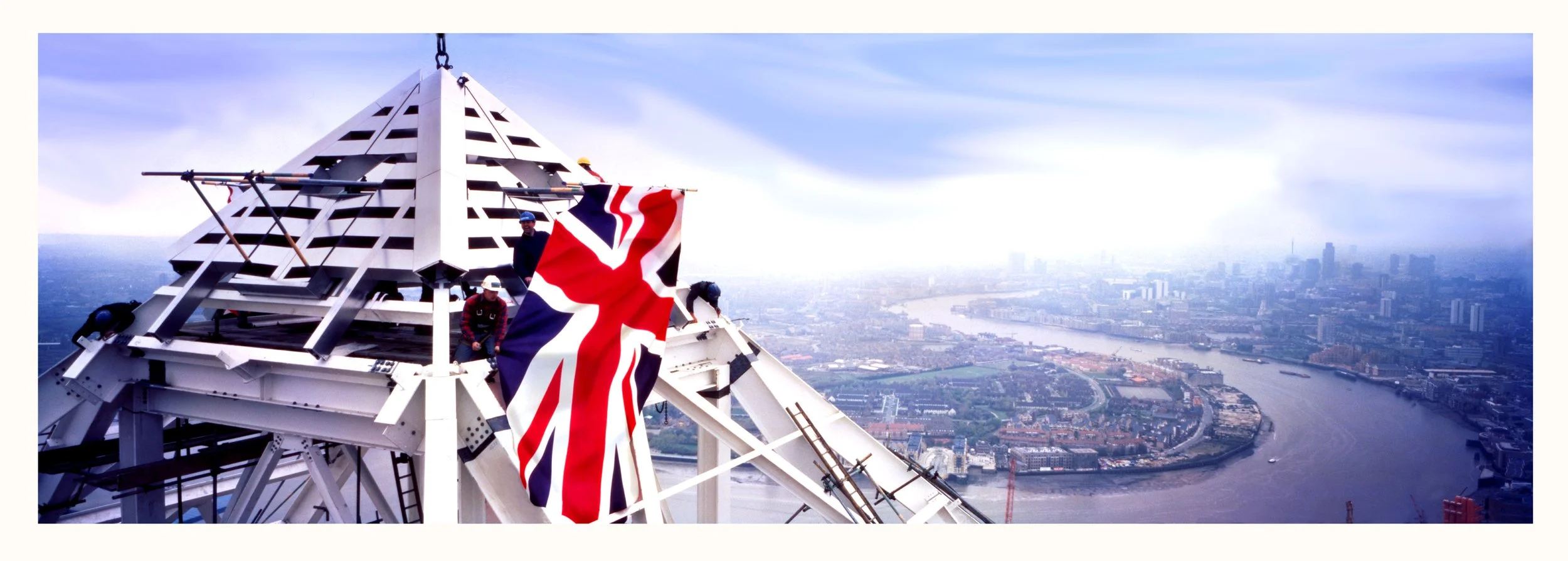 Final part of a series of images, thought lost for ever of the “topping out” in 1990 of One Canada Square. Photographed from an open wooden crate attached by a single chain to a crane, suspended at 850ft whilst battling high winds gusting 50knots.