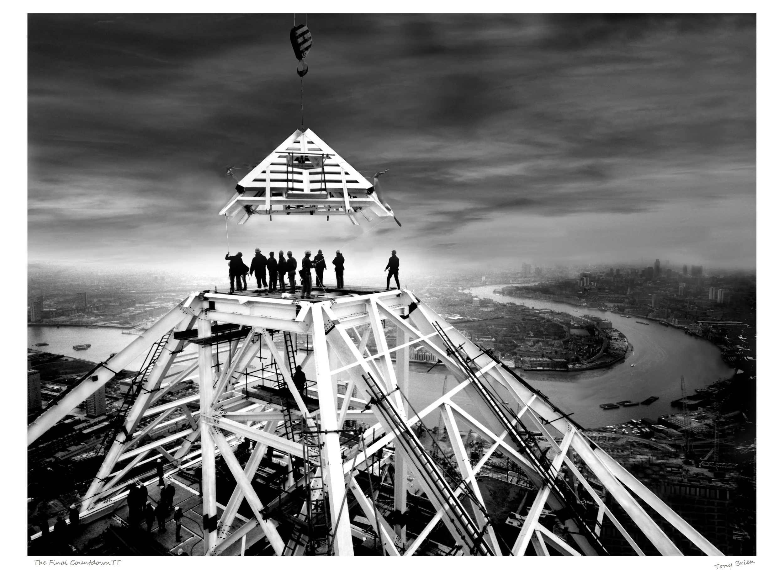 As the title suggests, the final moment before “touchdown”. The image silhouetting and capturing a moment of real live action. The heroic, skilful and somewhat crazy steel workers grappling to manoeuvre the 10 ton steel pyramid with ropes onto the top of the tower. Battling a treacherous November 1990 day with very high winds and gusting at 50 knots. These Steel workers are fully ware, that at any moment, a wrong move from anyone, and they could be catapulted off the tower, that is teamwork of the highest order.